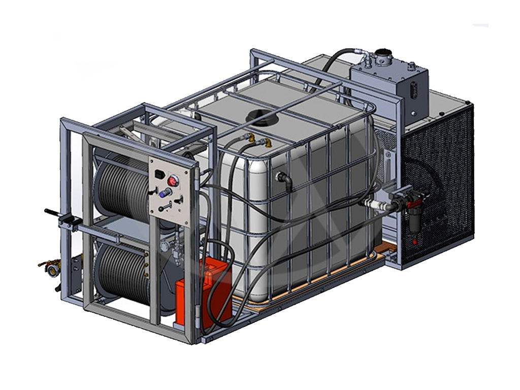 - Устройство для прочистки труб водой под высоким давлением РО-ДЖЕТ 90/150 на металлическом каркасе с бензиновым двигателем Kohler CH1000 мощностью 40 л.с., приводящим в действие трехплунжерный итальянский насос Pratissoli KT32, который нагнетает рабочее давление в 150 бар, что позволяет прочищать трубы и каналы диаметром от 50 до 500 мм и длиной до 80 метров.