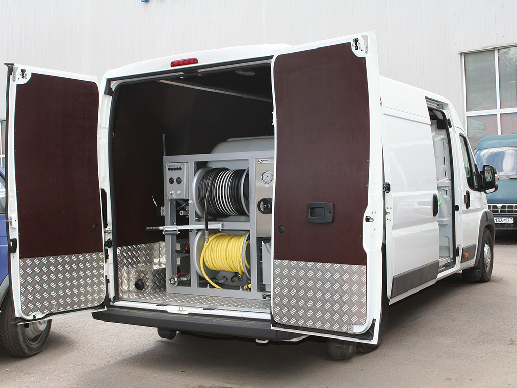 - Прочистка труб от диаметра 40 мм. Имеется передвижной барабан со шлангом для труб малых диаметров.